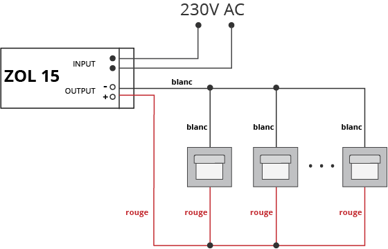 Les lumières nécessitent des alimentations à découpage, des dispositifs électroniques de puissance et des circuits de tentions de 10V DC. Les transformateurs Skoff sont petits et légers. Certaines versions (ZOL 7, ZOL 15) s'adaptent aussi aux boîtes de montage standard. Vous trouverez ici un exemple de connexion électrique des luminaires avec des transformateur :
